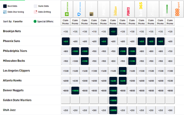 爵士队2-0快船后他们的夺冠赔率已经提升到+250至+300直逼篮网,篮网目前夺冠赔率还是联盟第一+120至+135.快船的夺冠赔率已经下滑到联盟第六了,篮网、爵士、太阳、费城、雄鹿都在快船之前,快船51年不入分区决赛的魔咒看上去要继续延续了。