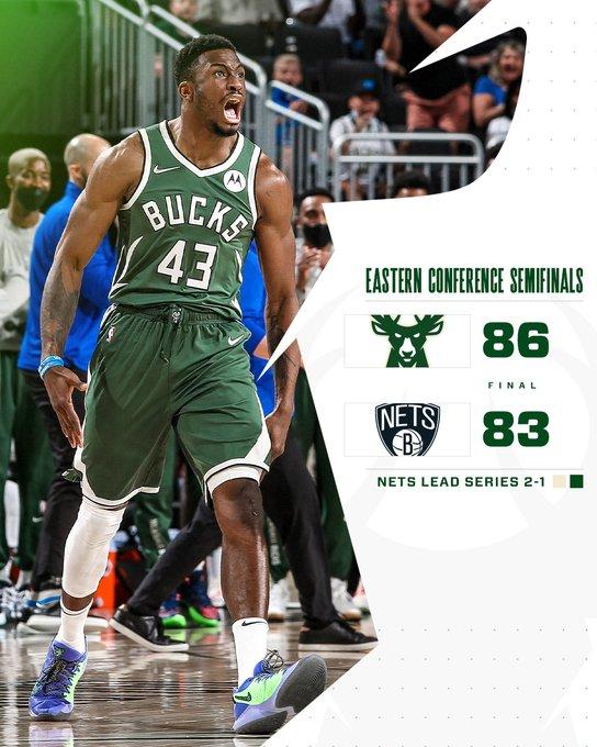 雄鹿回到主场后以86-83险胜篮网,大比分扳成1-2,字母哥很强势的打篮下拿到33分14篮板2助攻,米德尔顿回到主场后也找回了手感,全场比赛35分15篮板1助攻,这两人成为雄鹿击败篮网的关键,不过这场比赛雄鹿前三节一直领先到在末节险些被逆转,若杜兰特的绝平三分命中那可能雄鹿又要输球,篮网在让了一个哈登的情况下都让雄鹿如此艰难,所以这轮系列赛几乎没有悬念了。