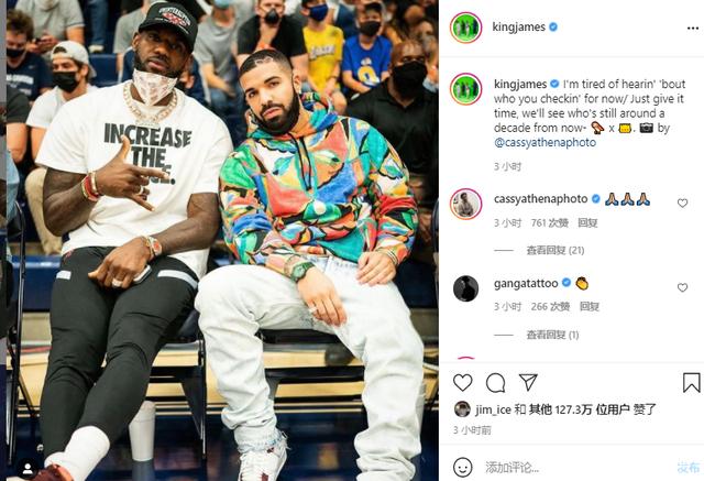 昨天布朗尼伤愈复出,詹姆斯到现场观战,说唱歌星Drake以及杜德利、JR史密斯也来捧场;不久前詹姆斯晒出他与Drake坐在场边的同框合影,并且写道:我已经厌倦了听说你现在关注的人是谁;给点时间吧,我们会看到10年后谁仍然还在这里。