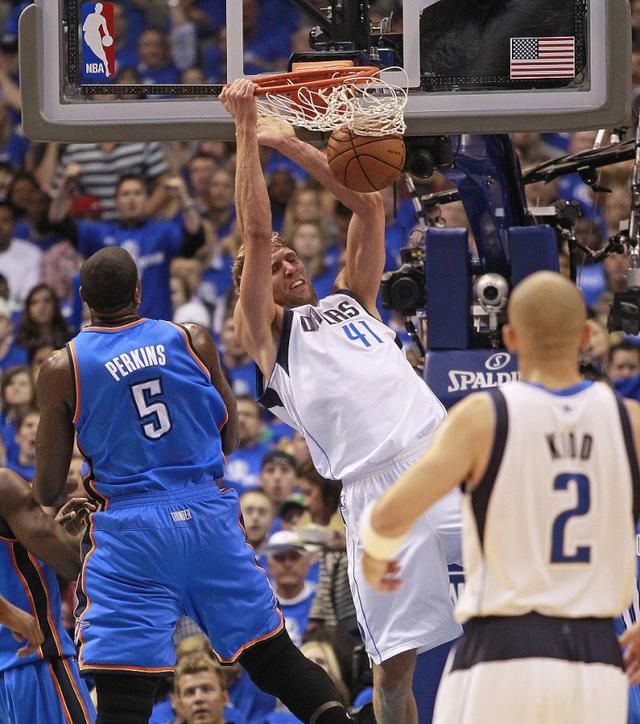 G4,小牛第四节最后5分钟落后15分。德克扛起了球队,最后3分半钟独得11分,一己之力带队杀入加时。加时赛雷霆仅得到4分,老基德左翼底角晃飞威少命中致胜冷血三分,德克全场出战45分钟砍下40分带队夺得赛点。
