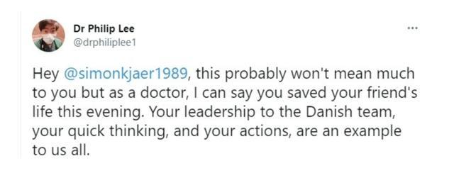 赛后,丹麦队队医也是盛赞克亚尔“你救了队友的生命,你在丹麦国家队的领导力,你的快速思考和做出的反应,对于我们所有人来说都是榜样!”