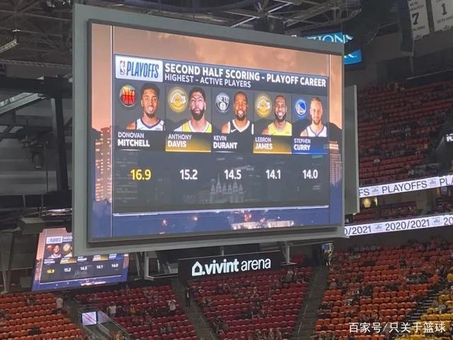 爵士和快船第二场比赛赛前,爵士主场的大屏幕上列出一组现役球员季后赛生涯下半场场均得分排名。