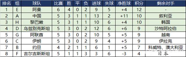 从现在的形势看,最后一轮,除了积12分排名第一的阿曼已经完成比赛,剩下的第二名的各个球队几乎都会在剩下的比赛里面对本组最强的对手。同样积10分的黎巴嫩将面对韩国,积9分乌兹别克斯坦的对手是沙特阿拉伯,积9分的阿联酋对手是越南,而同样积9分的约旦的对手是伊拉克。目前少赛一轮积7分的约旦对手是科威特和澳大利亚。而中国队对手是叙利亚。因此最后一轮的较量,中国队已经将主动权安全攥在自己手中,这和上一届完全看临场对手,竞争对手,友邦朋友的脸色完全不同。