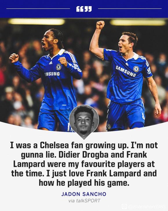 桑乔坦言,希望能回到英格兰赛场,那是梦开始的地方!2000年出生的桑乔见证了英格兰足球最兴盛的时代,而作为一个地道的伦敦人,桑乔表示他不是阿森纳的球迷,他童年偶像是德罗巴和兰帕德,小时候是切尔西球迷,希望长大后能为蓝军踢球!