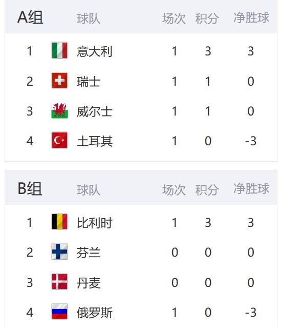A组的竞争非常激烈,12日晚上结束的小组赛第二场比赛中,瑞士和威尔士1比1握手言和。第49分钟,恩博洛为瑞士先进一球,他的头球攻门让威尔士防线无可奈何。第73分钟,威尔士追平比分,进球的是高中锋穆尔,他接到队友的传中,同样是用头球为球队扳平比分。最终,两队各自拿到1分。之前结束的揭幕战比赛,意大利3比0击败土耳其,下一轮意大利对阵瑞士,威尔士对阵土耳其,小组出线资格争夺会很激烈。