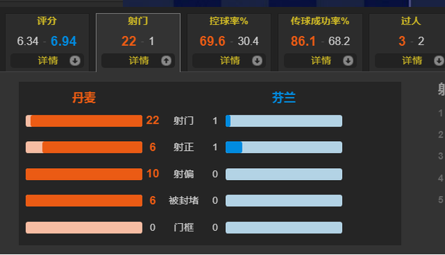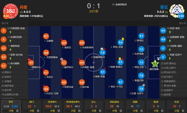 全场比赛,丹麦控球率接近七成,一共有22次射门,其中6次射正,而芬兰仅有1次射门,就打入全场唯一的进球。埃里克森的意外影响了丹麦球员的情绪,加上霍伊别尔的点球毫无质量,最终丹麦主场0-1芬兰,小组出线已经变得非常困难。