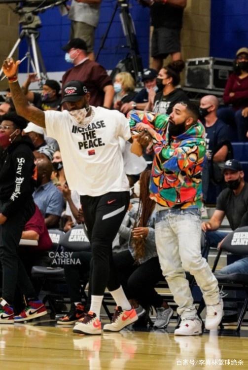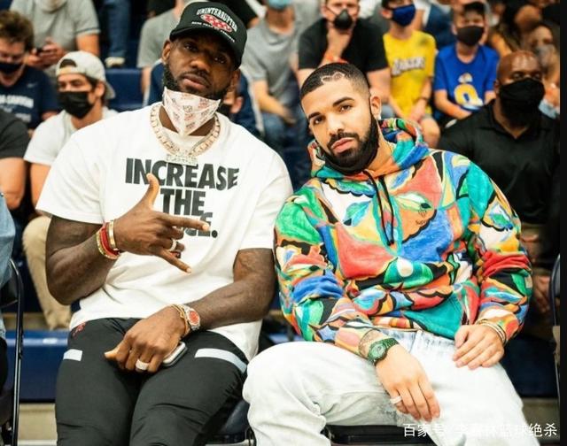 到了比赛精彩处,他们都站了起来观看比赛。还有一张照片,詹姆斯兴奋手舞足蹈,Drake表情也很激越。