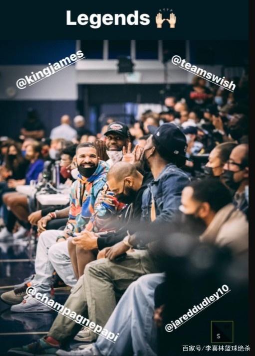 当天还有其他一些照片流传出来。詹姆斯、德雷克、杜德利和J.R.史密斯坐在一起观战。