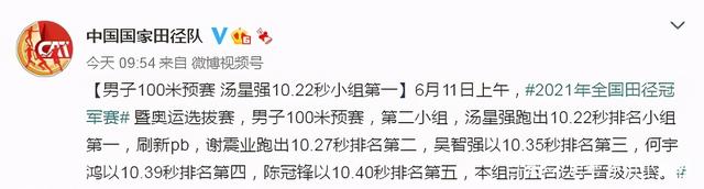 2021年全国田径冠军赛拉开战幕,在男子100米预赛中,苏炳添以10秒13排名第一,轻松晋级决赛,谢震业跑出了10秒27,以总成绩第四名跻身决赛。值得一提的是,汤星强跑出10秒22,创造个人最好成绩,2003年出生的严海滨跑出了10秒23,打破全国青年纪录。