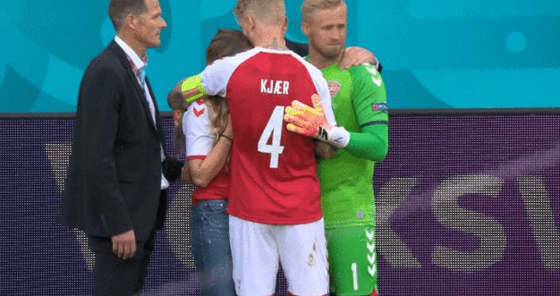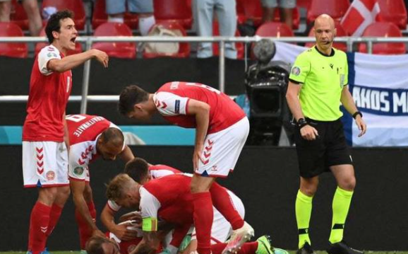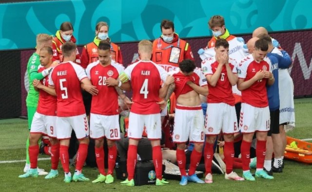 本场比赛进行第43分钟,占据优势的丹麦队攻势迅猛。球队核心埃里克森正走到边线接应队友界外球。然而,还没等到队友传球,埃里克森倒下了。