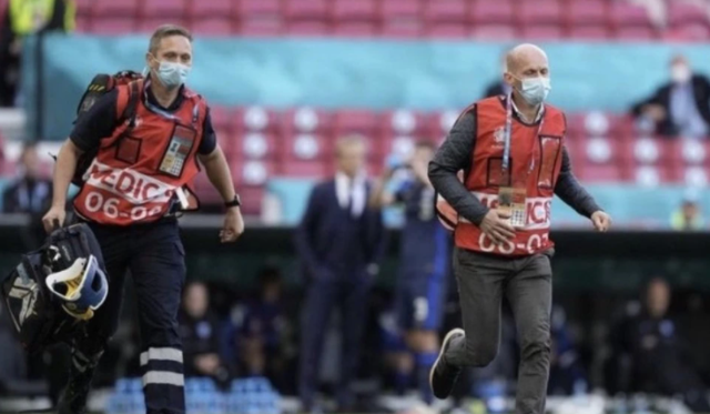 比赛暂停后,丹麦队医几乎是以冲刺的速度奔向了场内。随后,赛事紧急救援人员迅速加入了治疗。