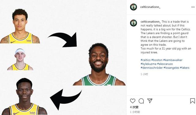 美国媒体凯尔特人国度建议湖人与凯尔特人进行交易,湖人的筹码就是凯尔-库兹马+丹尼斯-施罗德+亚历克斯-卡鲁索,也就是湖人3换1得到肯巴-沃克。此前魔术师约翰逊就公开表示施罗德并不是湖人,他没有那种拼劲,湖人休赛期大概率会先签后换他,所以这笔交易建议还算中肯,沃克才31岁他联手詹眉必然可以有更优异的发挥,怎么说也是东部多年的全明星控卫。