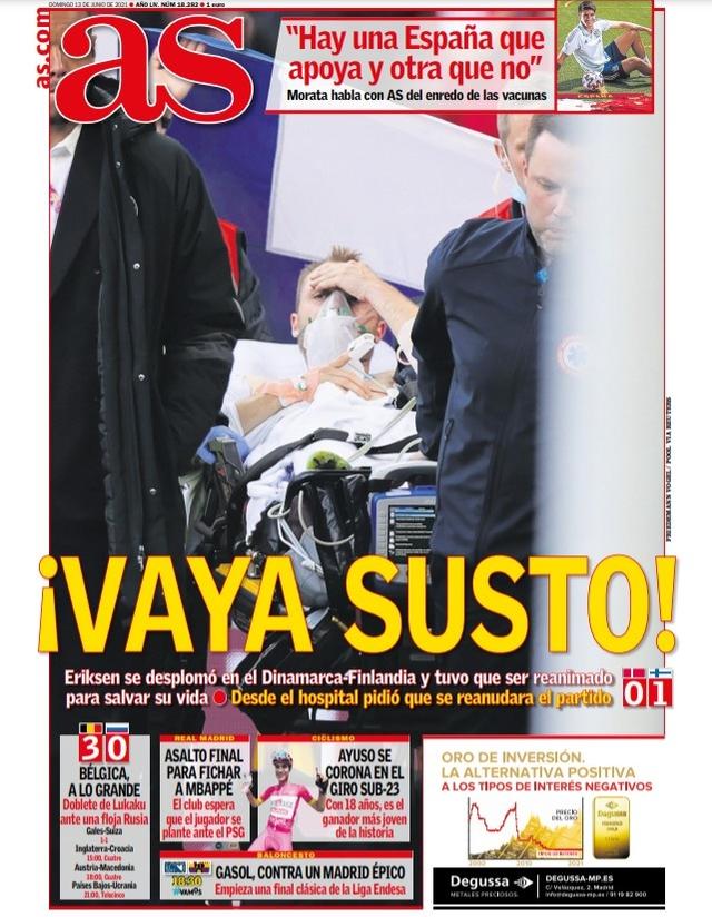 1、“我们已经有欧洲杯冠军了:队医们”,在丹麦与芬兰的欧洲杯比赛中,丹麦中场埃里克森突然昏倒,队友们迅速入场,立刻对埃里克森进行抢救,在经过超过15分钟的治疗后埃里克森情况稳定下来,他正在医院等待接受更多的检查。
