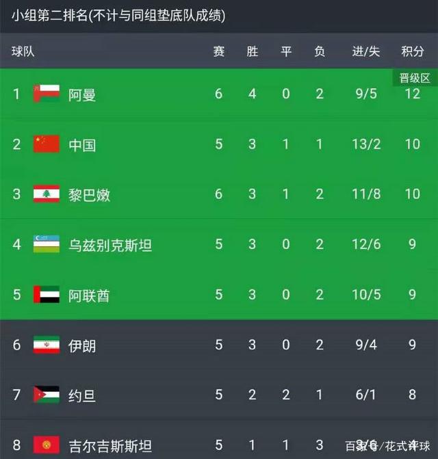 从(上图)这个各小组第二名的排名榜中可以看到,8个小组第二名,只能有5队晋级到12强赛,这等于国足如果想出线,就必须要在成绩上超过其中任意3个对手。