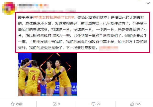 同样的,主帅郎平对于这样的比赛,也是有所点评的,那就是,郎平表示:“整场比赛我们基本上是按自己的计划去打的,总体来说还不错,发球贯彻得好,前两局在网上也压制住对方了。但是第三局我们的失误增多,扣球送三分,发球送三分,一传送一分,光是失误就送了七分,所以相对来说打得吃力一些。另外到第三局对手适应我们了,她们也要放手一搏,主动用发球冲击我们,我们的暴露性强攻命中率不高,加上对方主攻扣球变线,我们的应变还是慢了,下一场要注意改进。”