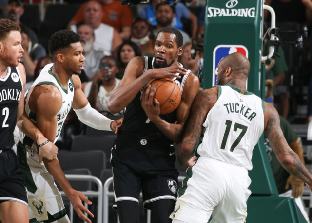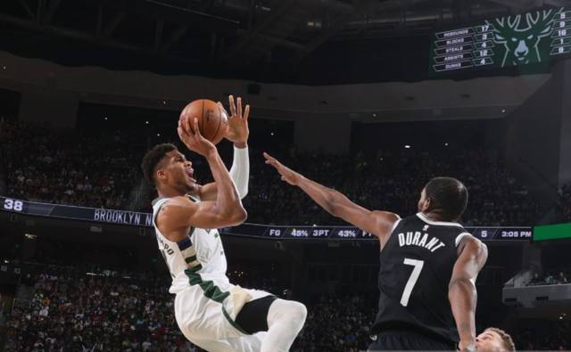 但下半场回来,少了欧文,雄鹿疯狂夹击杜兰特,塔克不断上身体对抗,篮网的进攻开始陷入停滞,雄鹿一度将分差拉开到20分,但三节末端,篮网顽强追分,将分差追到只差12分。末节比赛,分差继续拉开,比赛失去悬念。