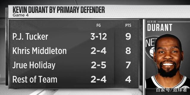 系列赛G4杜兰特进攻手感一般,据统计杜兰特面对PJ-塔克的防守12投3中仅仅拿到9分,面对米德尔顿的防守4投2中拿到8分,面对霍勒迪5投2中拿到7分,面对其他雄鹿球员是4投2中4分;很明显,塔克又限制住了死神,杜兰特和鞋王之间的碰撞太激烈。