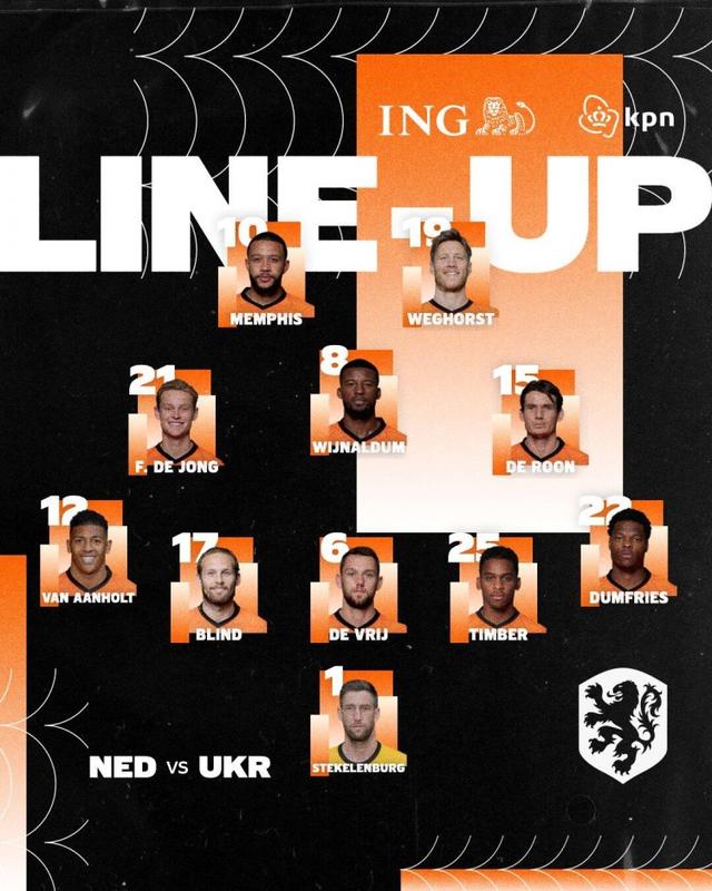 荷兰首发:1-斯特克伦博格、22-邓弗里斯、6-德弗里、25-尤里恩-廷伯、17-布林德、12-范安霍尔特、8-维纳尔杜姆、15-德容恩、21-弗兰基-德容、19-维霍斯特、10-德佩