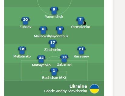 乌克兰首发:1-布什察、16-米克伦科、22-马特维延科、13-扎巴尔尼、21-卡拉瓦耶夫、17-津琴科、8-马利诺夫斯基、5-塞多尔丘克、7-亚尔莫连科、20-祖布科夫、9-亚列姆丘克