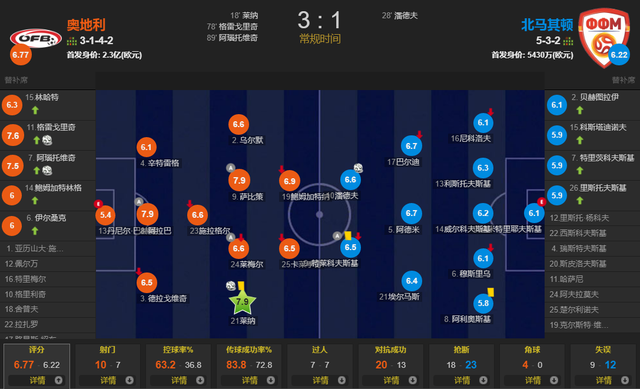 全场比赛,奥地利控球率超过了六成,一共有10次射门,其中6次射正,北马其顿有7次射正,其中2次射正。奥地利多人效力于德甲及其他欧洲联赛,整体实力确实远在北马其顿之上,双方奉献了一场精彩的足球,北马其顿踢得非常激情,但不毛躁,他们赢得了球迷的掌声,可以说是虽败犹荣。