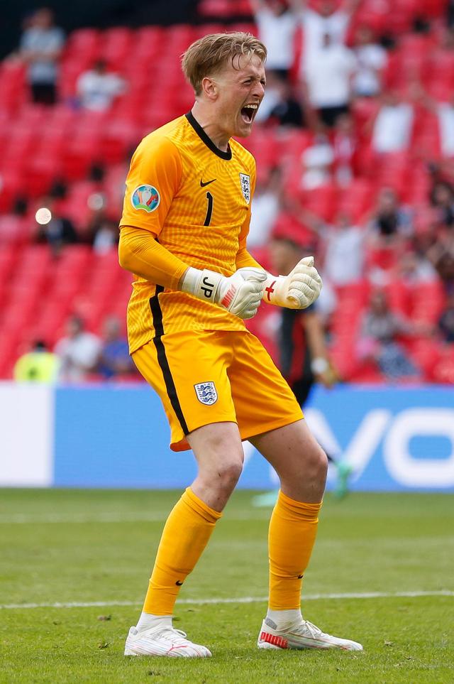 6月13日,英格兰队门将皮克福德在比赛获胜后庆祝。新华社记者 韩岩 摄