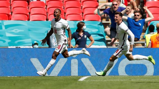 6月13日,英格兰队球员斯特林(左)进球后庆祝。 新华社记者 韩岩 摄