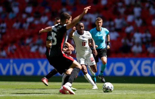 6月13日,英格兰队球员斯特林(右二)在比赛中带球突破。 新华社记者 韩岩 摄