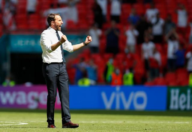 6月13日,英格兰队主教练索斯盖特赛后庆祝球队获胜。新华社记者 韩岩 摄