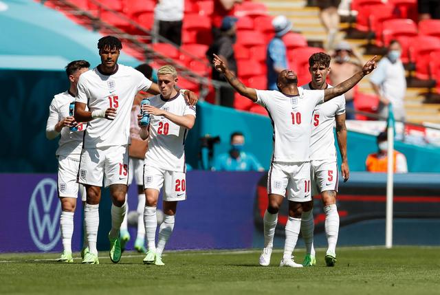 6月13日,英格兰队球员斯特林(右二)进球后庆祝。新华社记者 韩岩 摄