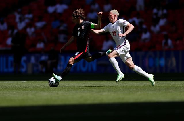 6月13日,克罗地亚球员莫德里奇(左)在英格兰队球员福登的防守下带球突破。 新华社记者 韩岩 摄