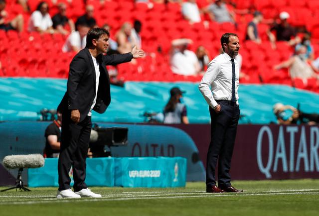 6月13日,克罗地亚队主教练达利奇(左)与英格兰队主教练索斯盖特在场边观战。新华社记者 韩岩 摄