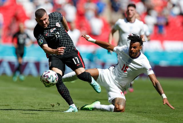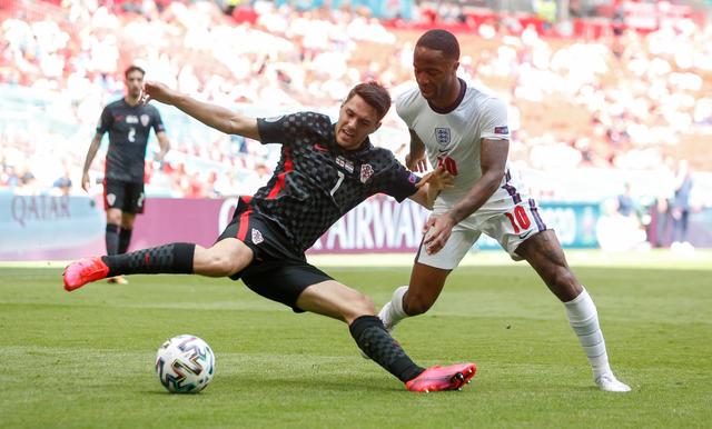 6月13日,英格兰队球员斯特林(右)与克罗地亚队球员布雷卡洛拼抢。 新华社记者 韩岩 摄