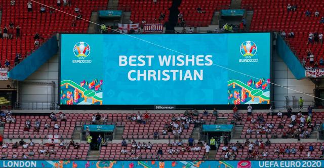 6月13日,开赛前,球场大屏幕显示对丹麦队球员埃里克森的祝福语。埃里克森曾在英超托特纳姆热刺队效力近七年。新华社记者 韩岩 摄