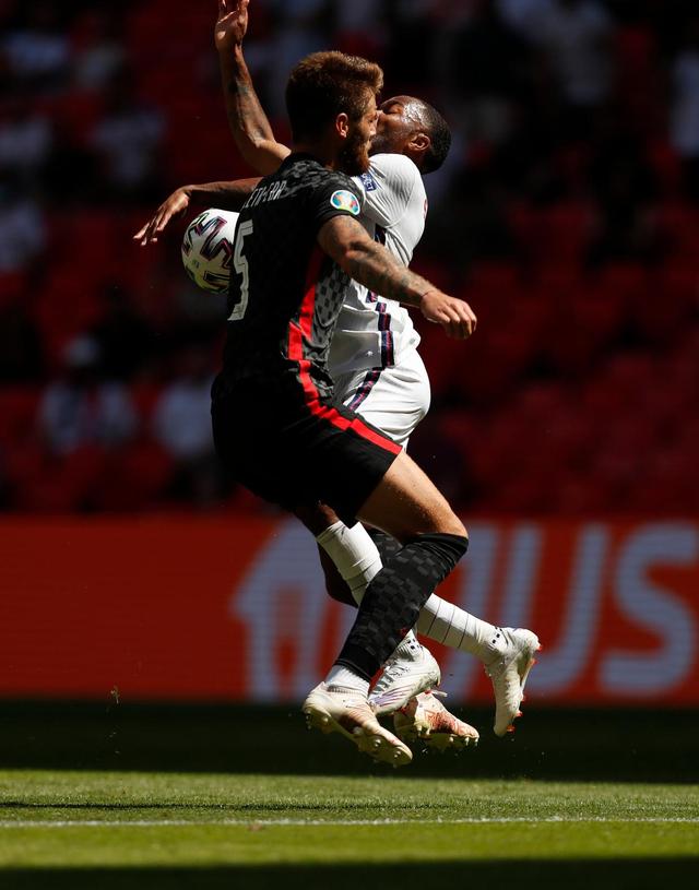 6月13日,英格兰队球员斯特林(右)与克罗地亚队球员卡莱塔-卡尔争顶。新华社记者 韩岩 摄