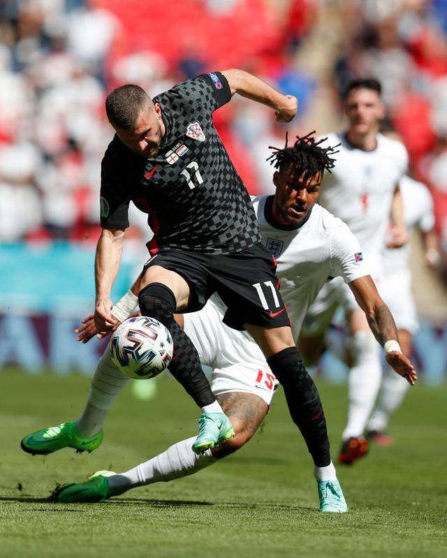 6月13日,英格兰队球员明斯(右)与克罗地亚队球员雷比奇在比赛中拼抢。 新华社记者 韩岩 摄