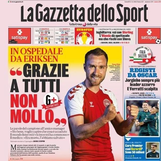 丹麦国脚埃里克森接受《米兰体育报》的采访,对大家的关心表示感谢:“谢谢你们,我不会放弃的,我现在感觉好多了。”