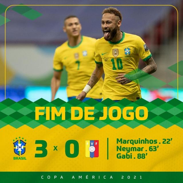 美洲杯揭幕战,B组第1轮巴西对阵委内瑞拉,上半场马尔基尼奥斯先拔头筹,下半场达尼洛造点,内马尔主罚命中,随后内马尔助攻巴尔博萨扩大比分,最终巴西3-0委内瑞拉取开门红。