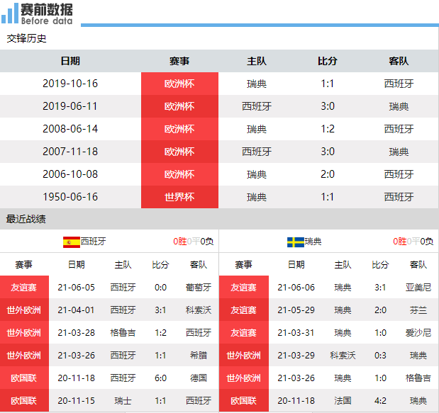 注:西班牙坐拥主场之利,瑞典是典型的客场虫,过去5个客场赛事有4场吃了败仗。