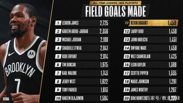 KD虽然本场砍下28分,但他25投仅9中。系列赛前两场,杜兰特投篮命中率高达55.8%,但是G3和G4他的投篮命中率降至37.7%,三分合计16中4。今天他迎来生涯里程碑,季后赛运动战进球数超越拉里-伯德,升至NBA历史第11位。