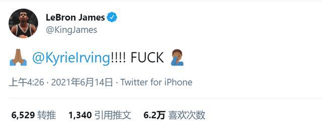 勒布朗-詹姆斯在欧文受伤的第一时间在社交媒体上为欧文祈福,他在推特上写道:“祈祷@KyrieIrving!!!!靠!