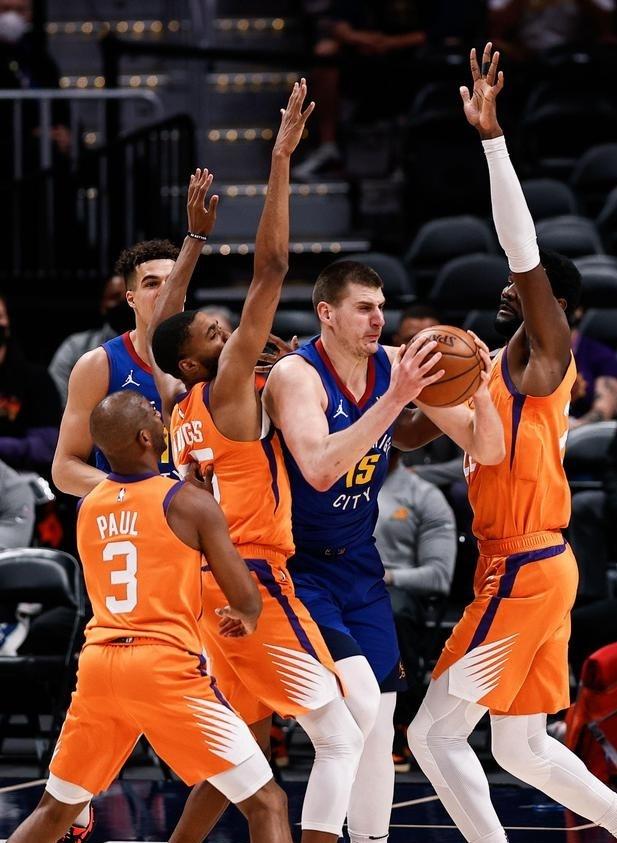 这场比赛首节,太阳队延续了前三场比赛那样的好状态,球队进攻表现高效,防守也很出色,球队单节拿到28分,取得6分的领先。进入到次节后,当掘金队打出高质量的反击时,太阳队总有球员能够挺身而出,他们在进攻端表现出色,单节再次拿到35分,净胜掘金队2分。半场比赛结束,太阳队手握8分的领先。