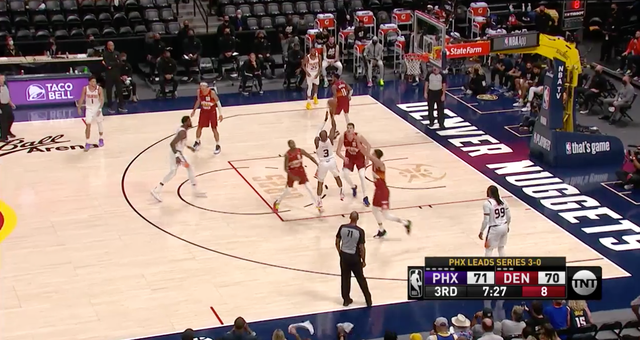 双方第四场比赛中,掘金采用的防守策略是三分线外紧逼压迫保罗持球,不给他借助掩护后投射三分的机会;同时,约基奇蹲坑篮下,防止保罗助攻队友空切。