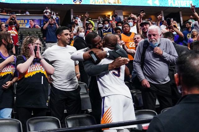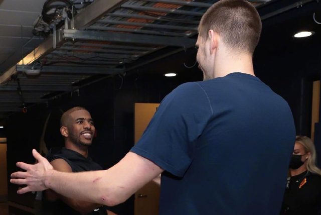 开局保罗和布克内突外投串联全队,一度拉开两位数领先优势。第二节小里弗斯和莫里斯连拿12分,一度追到只差2分,但保罗和克劳德连续命中关键球稳定局势。第三节保罗连续命中6记中投,掘金尝试反扑未果,约基奇连续成为背景板,发泄不满情绪时,对佩恩二级恶犯被驱逐。末节掘金再度追到这次哈4分,还是保罗,连拿7分杀死比赛悬念!保罗37分7助攻3篮板2抢断,布克34分11篮板4助攻,布里奇斯14分7篮板,艾顿12分7篮板。掘金这边,巴顿25分5篮板,约基奇22分11篮板,波特20分,莫里斯19分。赛后,约基奇在通道内等待保罗,和保罗紧紧相拥表达敬意。