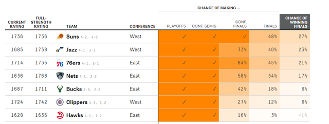 今天的比赛结束后,美媒《538》更新了最新的概率,太阳杀入总决赛的概率为48%,所有球队中最高!拿到总冠军的概率为27%,所有球队中最高!此外爵士晋级西决的概率也有73%,杀入总决赛的概率为40%,拿到总冠军的概率为23%,篮网晋级东决的概率只剩下58%,杀入总决赛的概率为34%,现在西部太阳占据绝对领先地位,以逸待劳,常规赛太阳3-0横扫爵士,用苏群老师的话来说,保罗终于可以展望一下总决赛地板了。