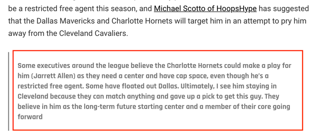 另一方面,据美媒迈克尔-斯科托的说法,独行侠和黄蜂都将会瞄准骑士内线悍将贾勒特-阿伦: