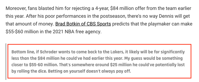 在2020-21赛季为湖人效力期间却并没能打出足够好表现的情况下,丹尼斯-施罗德的市场价值已经大幅下降。需要注意的是,施罗德在过去这个赛季曾拒绝湖人4年总价值8400万美元的报价,这也被普遍认为是“自视过高”的选择。