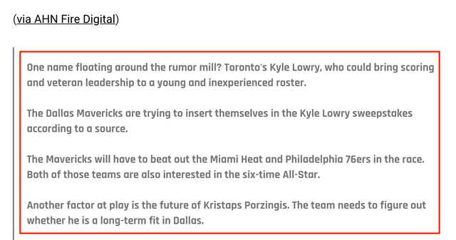 最后需要提及的是,据报道,独行侠将会在自由球员市场上瞄准猛龙老将控卫凯尔-洛瑞: