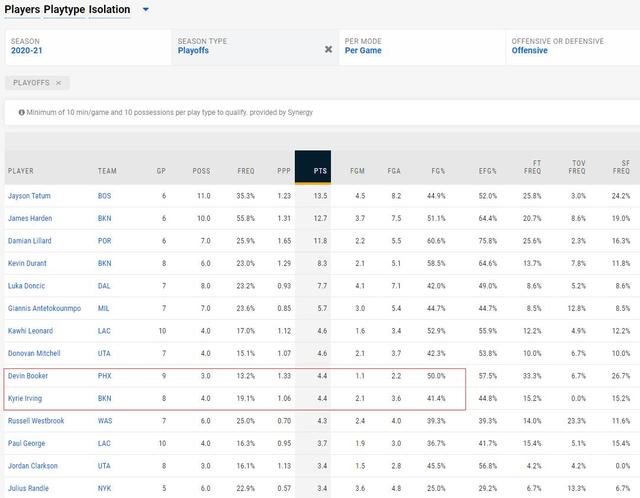 但横扫掘金队后,布克在季后赛的整体单打表现已经提升了很多。目前,他在季后赛场均单打可以得到4.4分和欧文并列联盟第9,但和单打命中率41.4%的欧文相比,布克单打的命中率达到50%。