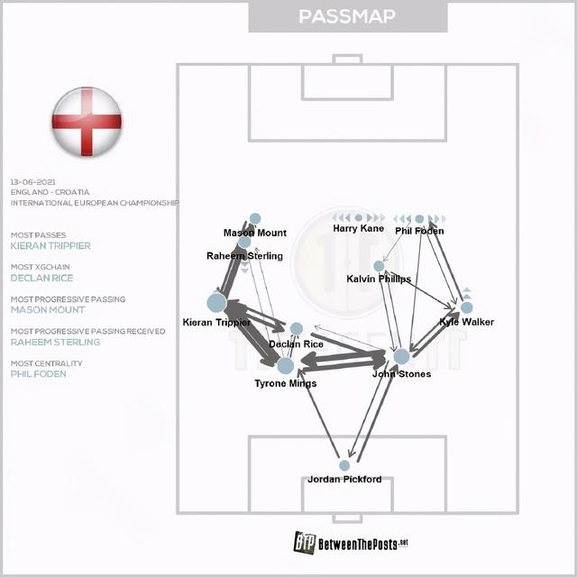 菲利普斯发挥亮眼,倒显得赖斯有些平淡,只从这场比赛来看,菲利普斯的身价应该比赖斯更高。赖斯的风格挺有意思,似乎如果需要赖斯踢中卫,他立马可以适应。在这场比赛中,赖斯已经会落位到禁区内,完全踢得像是一名中卫,帮助英格兰形成三中卫体系。从下方英格兰传球线路概要图也可以看出来。