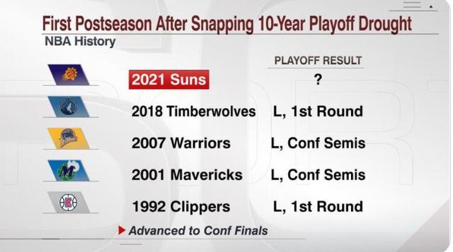 太阳是NBA历史第一支在刚结束10年季后赛荒后打进分区决赛的球队。